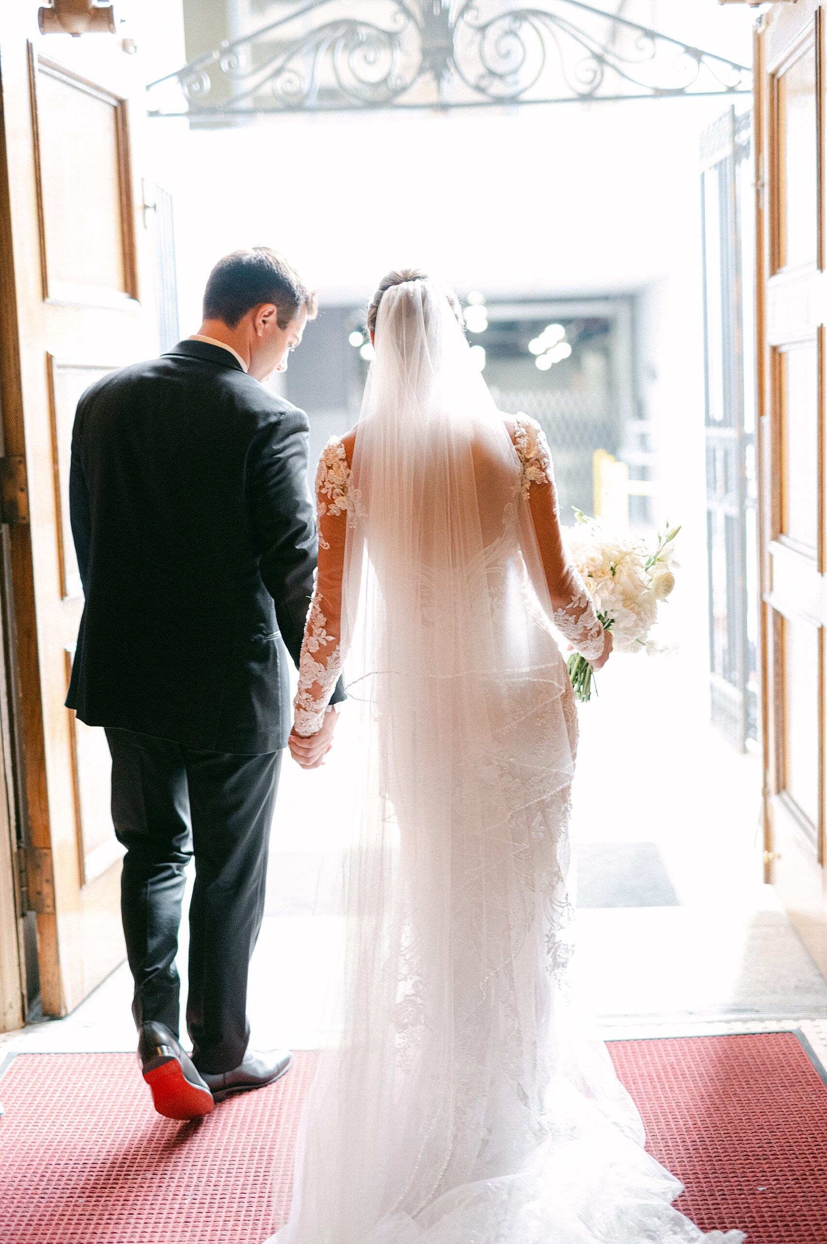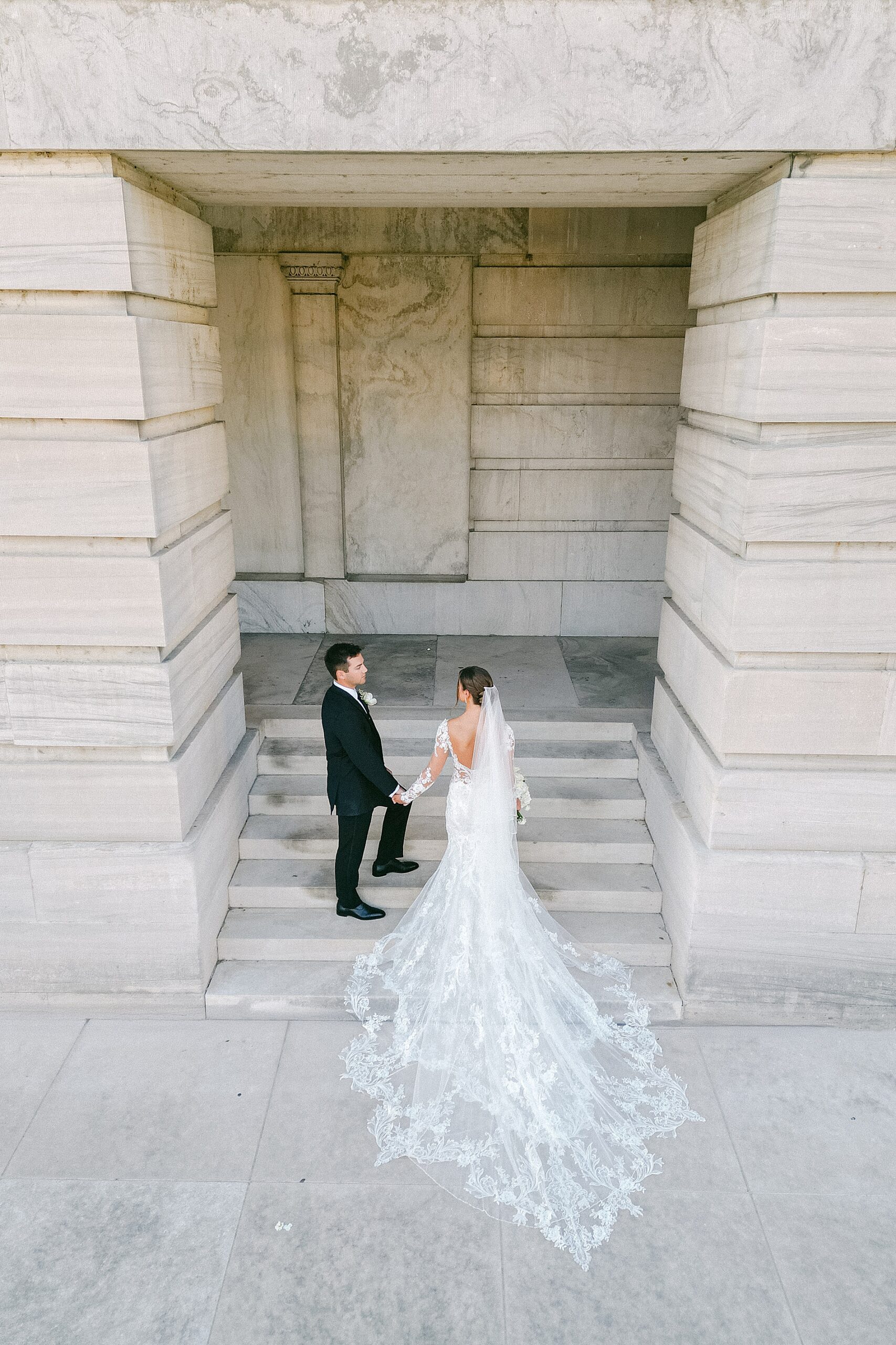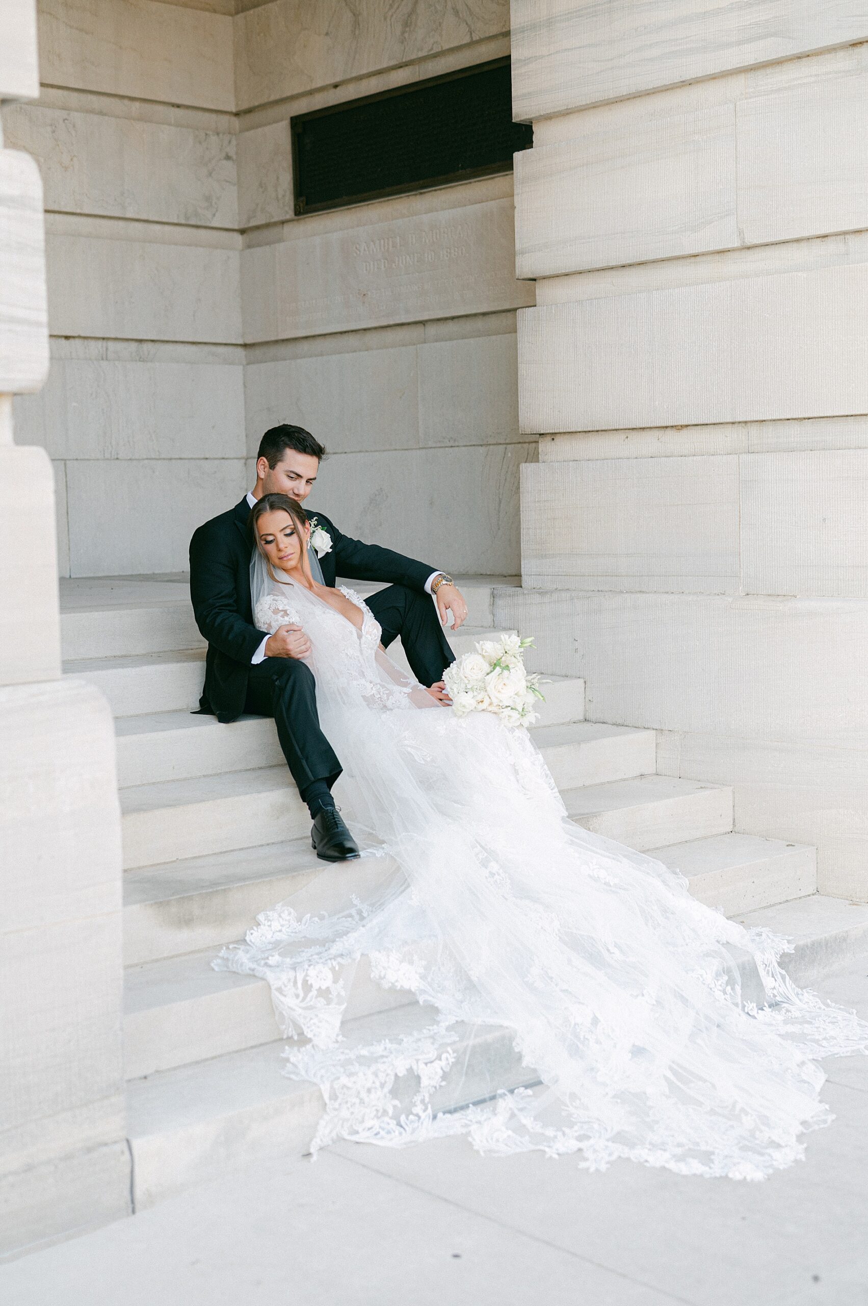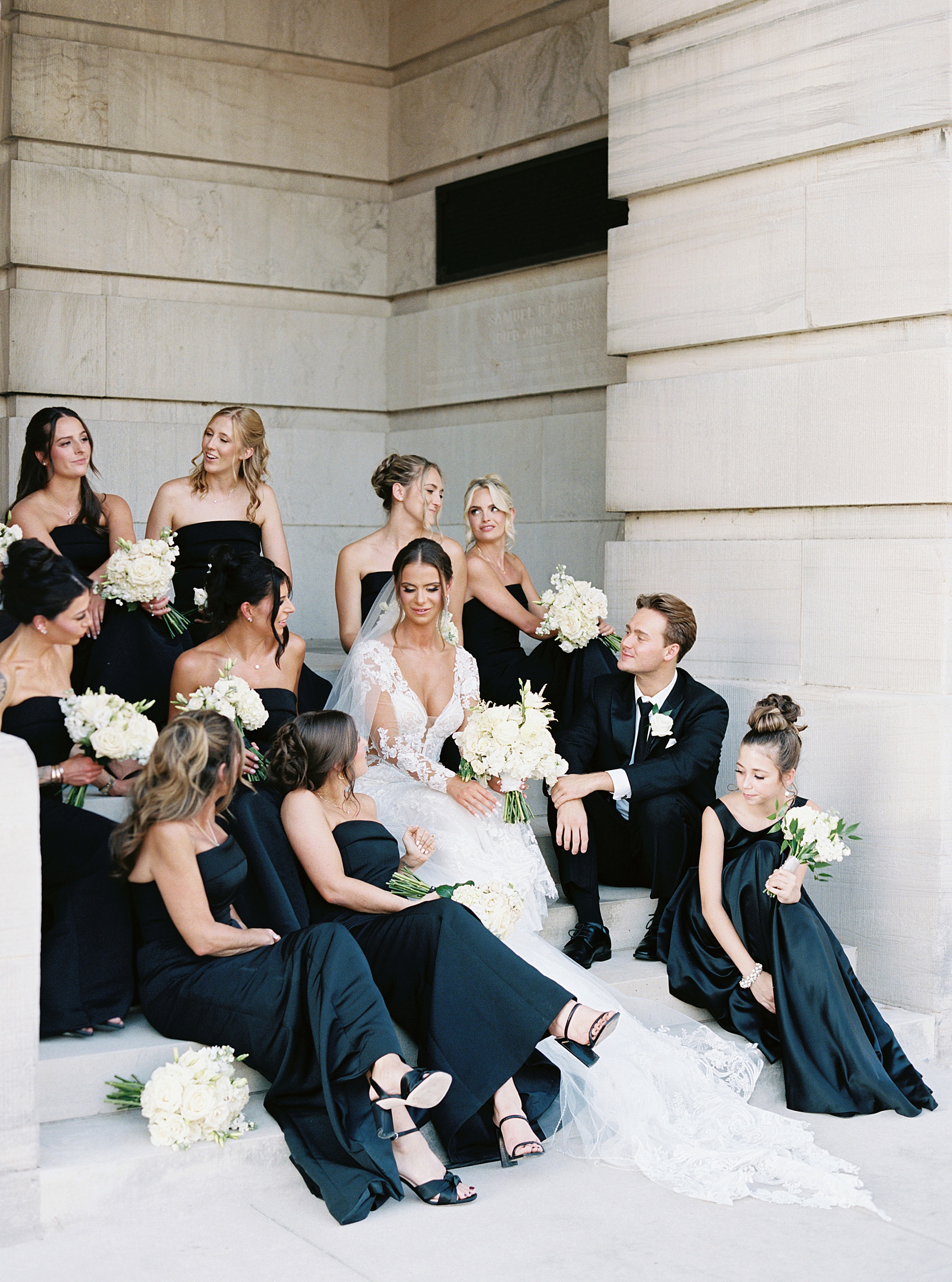 After their meaningful church ceremony we headed out to capture their wedding portraits and wedding party photos. The timeless architecture around downtown Nashville was the perfect backdrop. I love the various images we were able to capture using the stairs and the columns, as it completely elevated their portraits. Sophia looked breathtaking in her gown with a long veil flowing, lace sleeves, and intricate dress details. Watching her and Danny together, after seven years of dating and now finally stepping into marriage, was incredibly special.