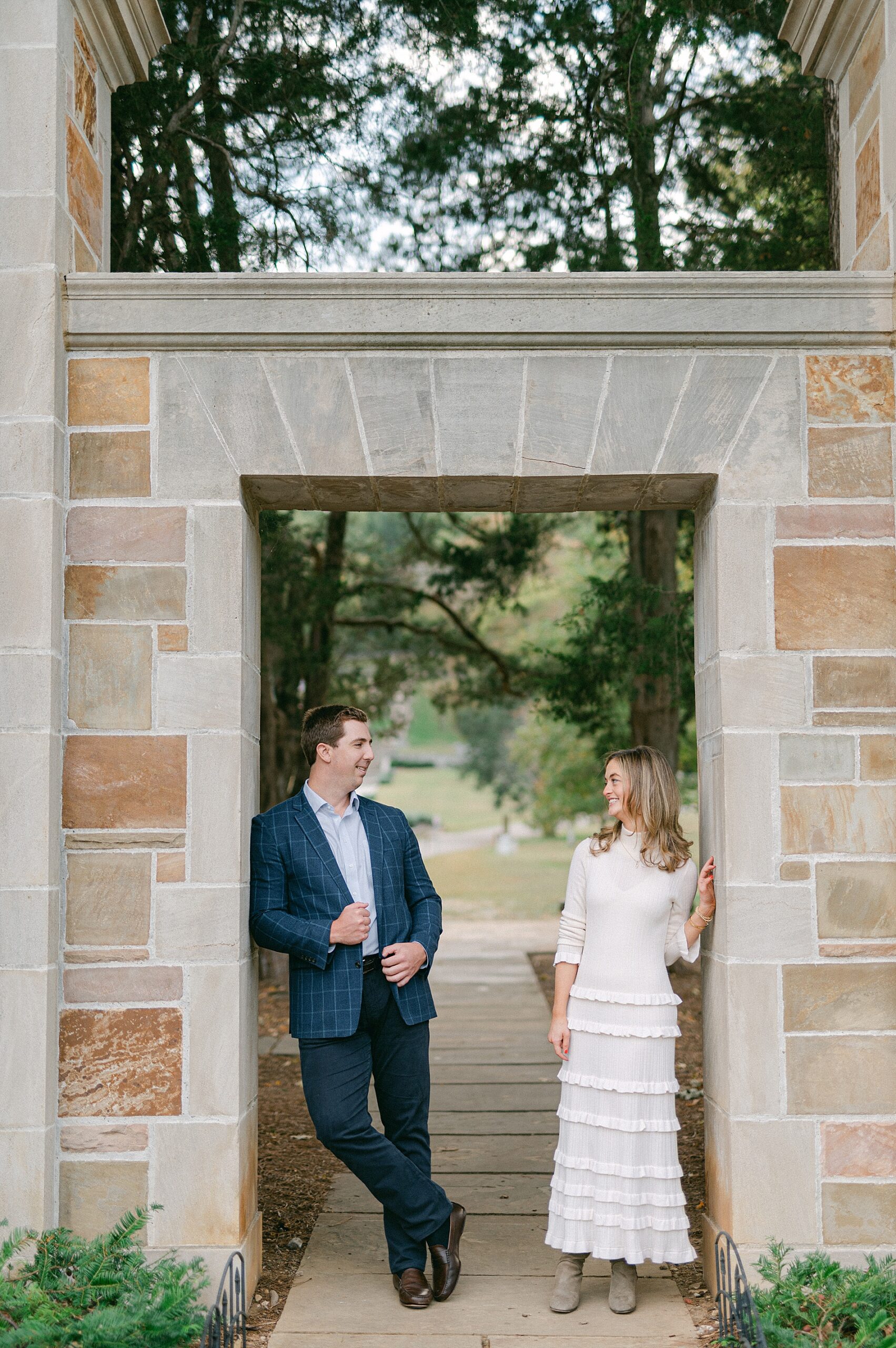 For their engagement session, Mary Kate and Jack chose the Percy Warner Steps, a Nashville favorite known for its stone architecture and timeless setting. The steps were the perfect backdrop for their session. Mary Kate’s look was classic and stylish, right down to her stunning handbag, which was one of my favorite details from the session. Jack wore a navy suit that looked great next to her white long sleeved dress. The outfits paired beautifully with the natural scenery and stone textures of the steps.